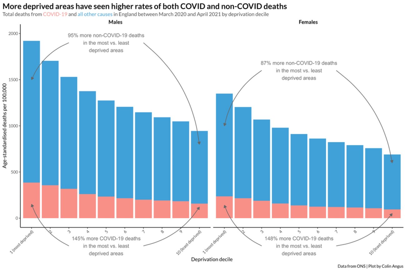 An example of the starkness of this disparity is the fact that, once you account for age differences between the groups, the most deprived areas in England recorded a Covid mortality rate that was two and a half times higher than the least deprived areas in the first year of the pandemic.