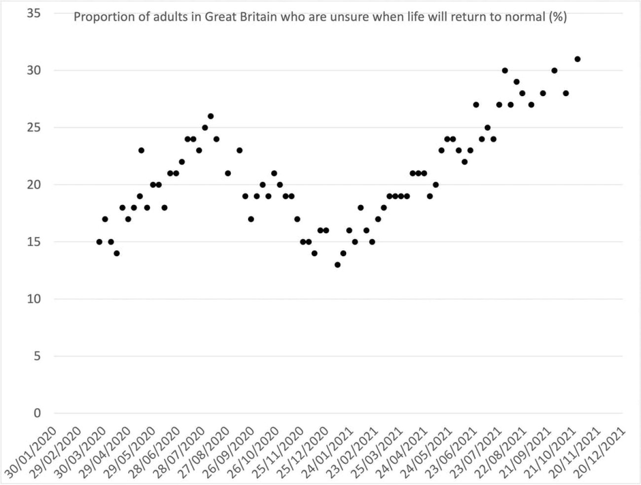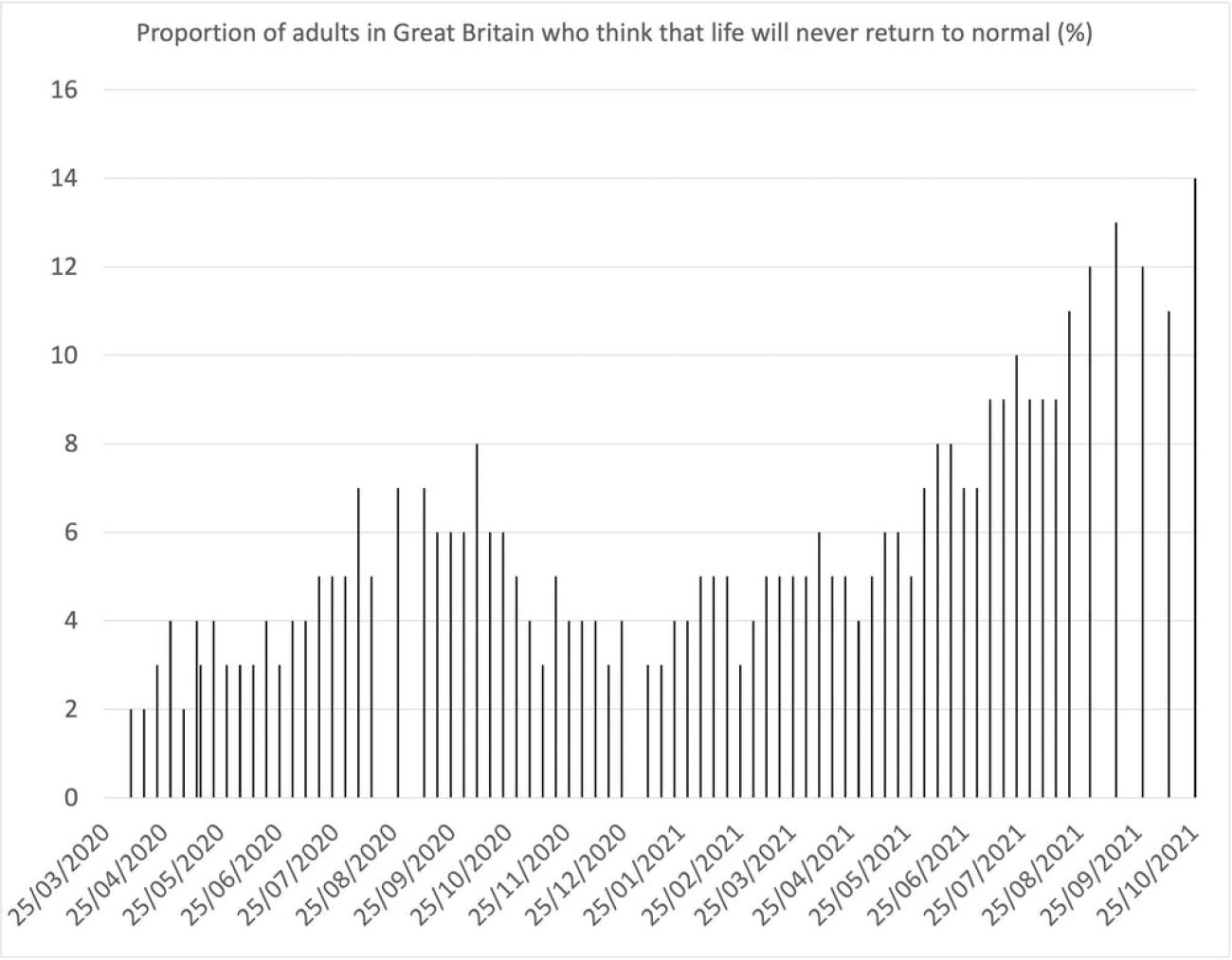 By the time of the 77th survey, which ended on November 14 2021, the proportion of people who said they were unsure when life would return to normal had doubled to 31%. The proportion who thought it would be at least a year before there was a return to normality had tripled to 35%. A further 14% thought that life would never return to normal ever again. And the proportion who thought that life would return to normal within a year had plunged from three-quarters to just a fifth. Our faith in a return to normality has collapsed.