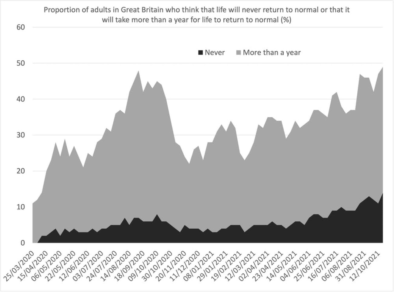 It’s a question that Britain’s Office for National Statistics (ONS) has been pondering too. On March 27 2020, the ONS began asking a large sample of the British population when they thought life would return to normal. This was very shortly after the first wave of the pandemic had begun, with Covid cases and deaths quickly rising. Britain was just days into its first lockdown.