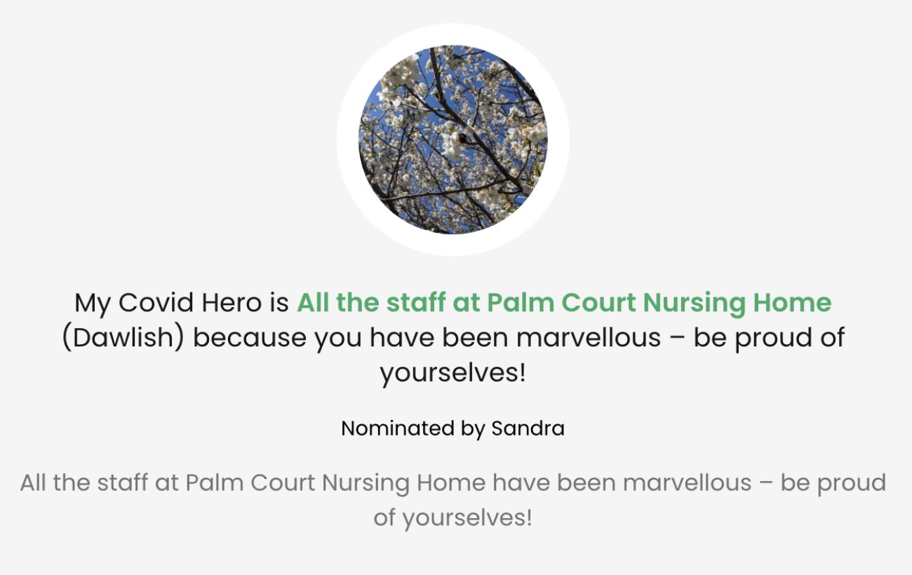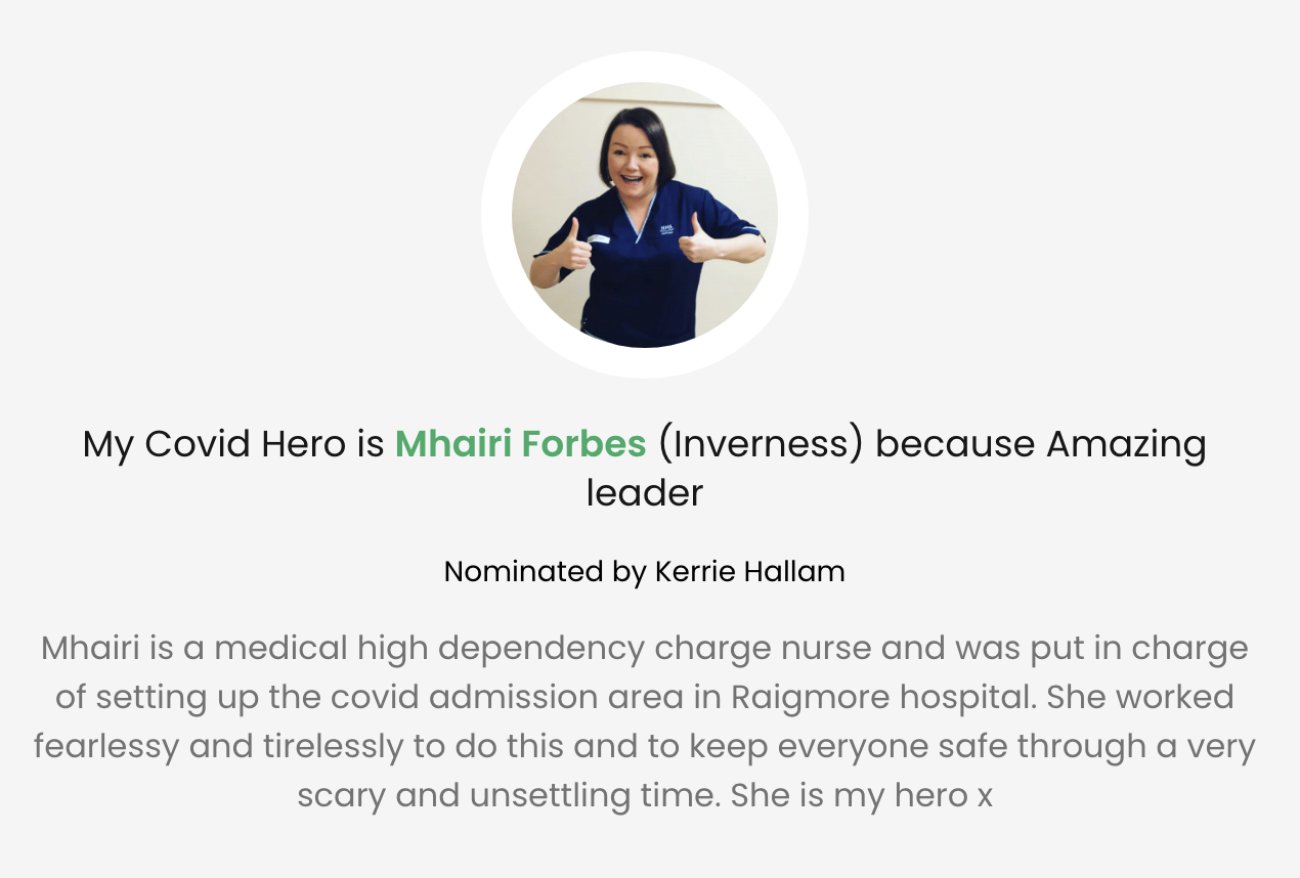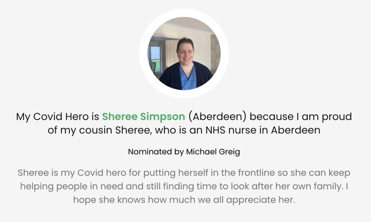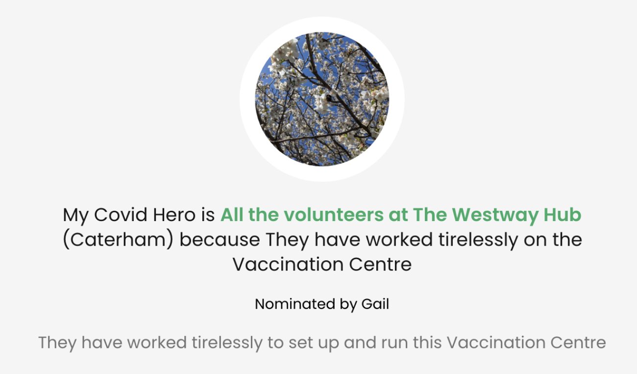 Each post includes a personalised message of thanks to the nominated Covid Hero with an optional photo attached. The posts then appear on the #CovidHeroes section of our website. Click here to nominate your Covid hero!