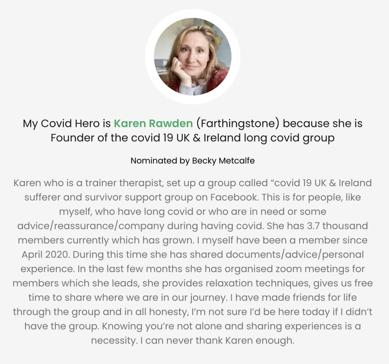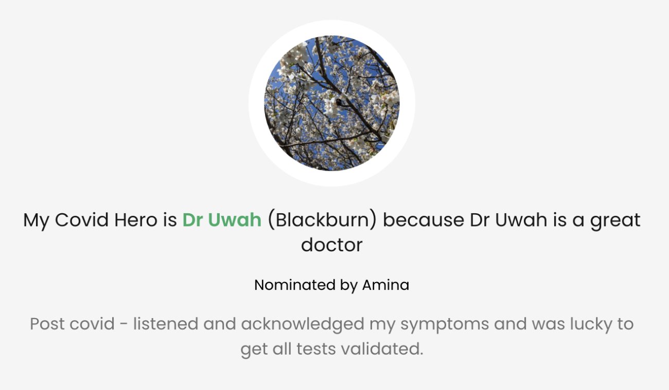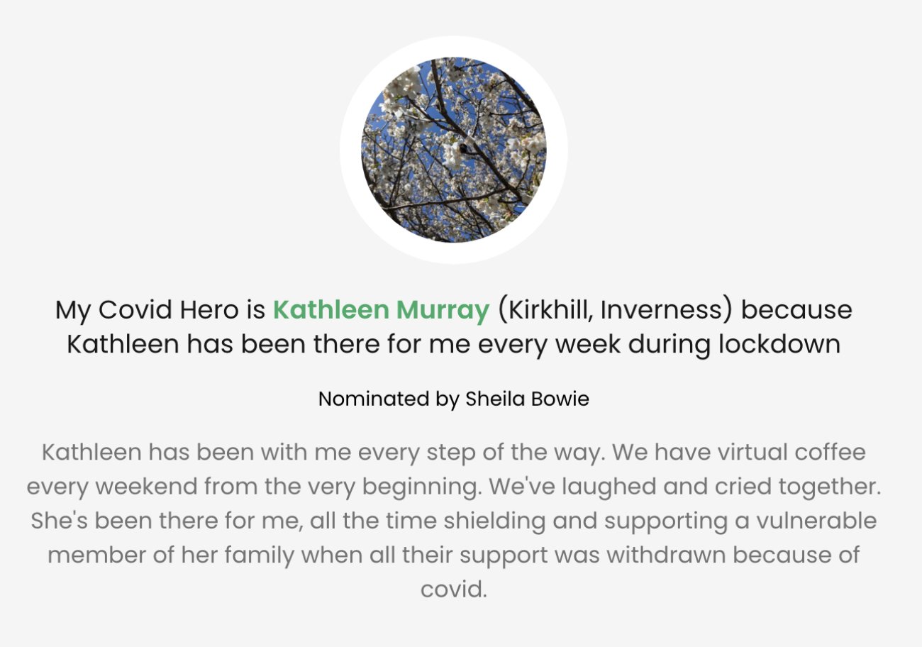 Each post includes a personalised message of thanks to the nominated Covid Hero with an optional photo attached. The posts then appear on the #CovidHeroes section of our website. Click here to nominate your Covid hero!
